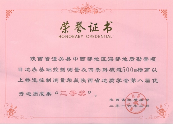 陕西省潼关县中西部地区深部地质勘查项目地表基础控制测量及四条斜坡道500m标高以上巷道控制测量荣获陕西省地质学会第八届优秀地质成果三等奖