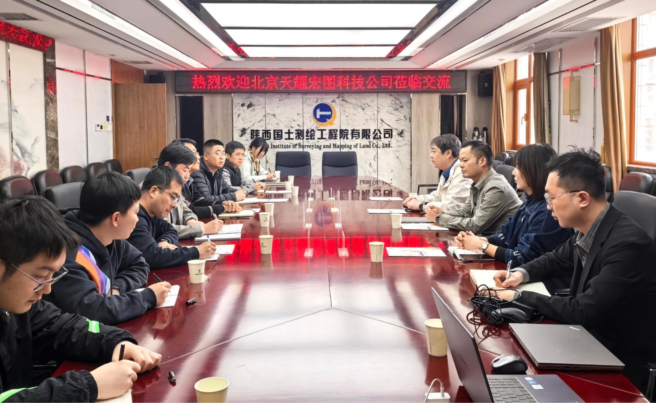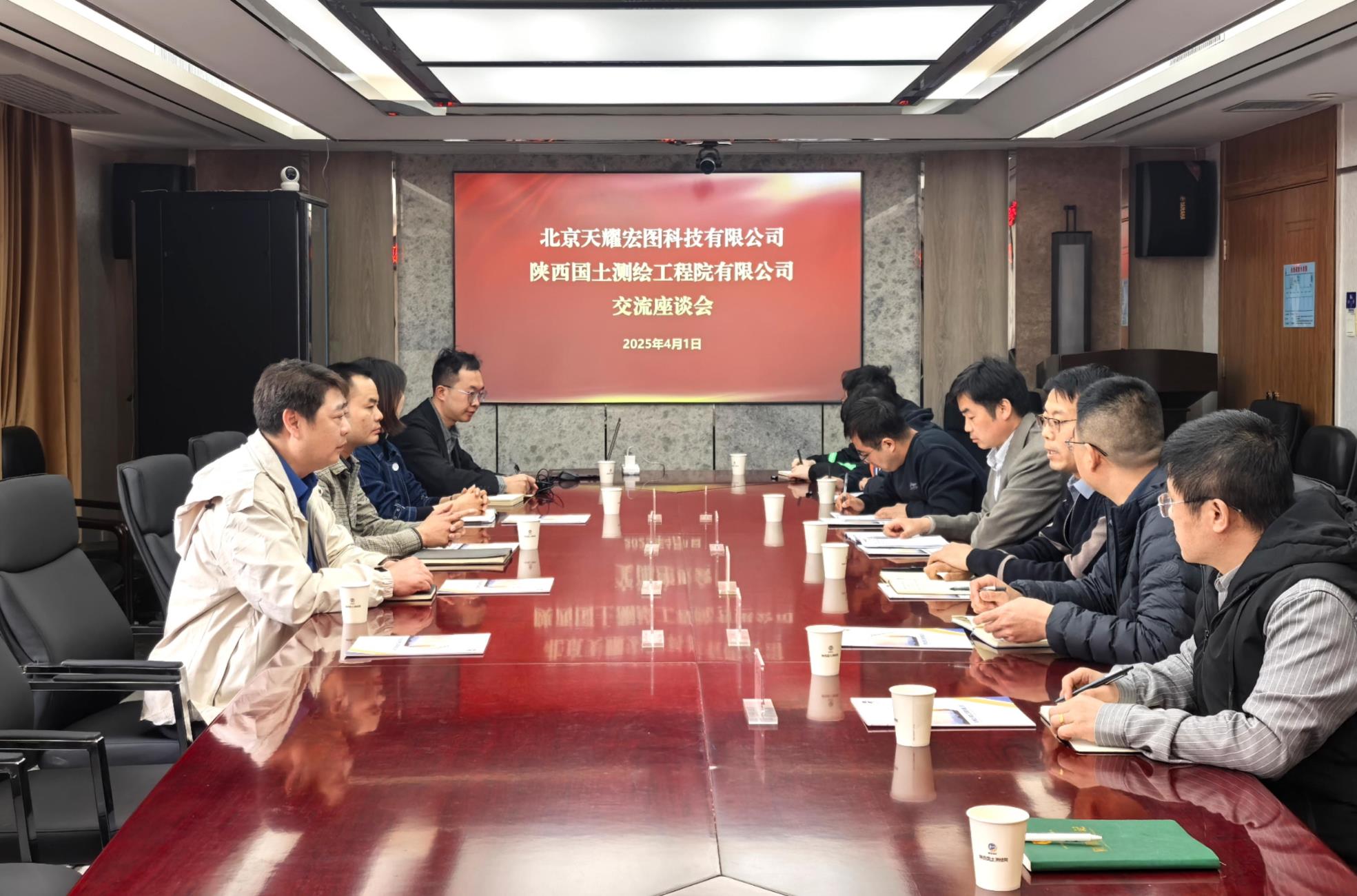 4月1日上午,北京天耀宏图科技公司陕西负责人王震宇一行来云博体育中国官方网站座谈交流,公司副总经理崔安波出席并主持会议,陕西国测院科技公司执行董事、总经理李彦宏,副总经理晁林涛,测绘院技术质量部副主任韩帆以及相关部门技术人员参加会议。