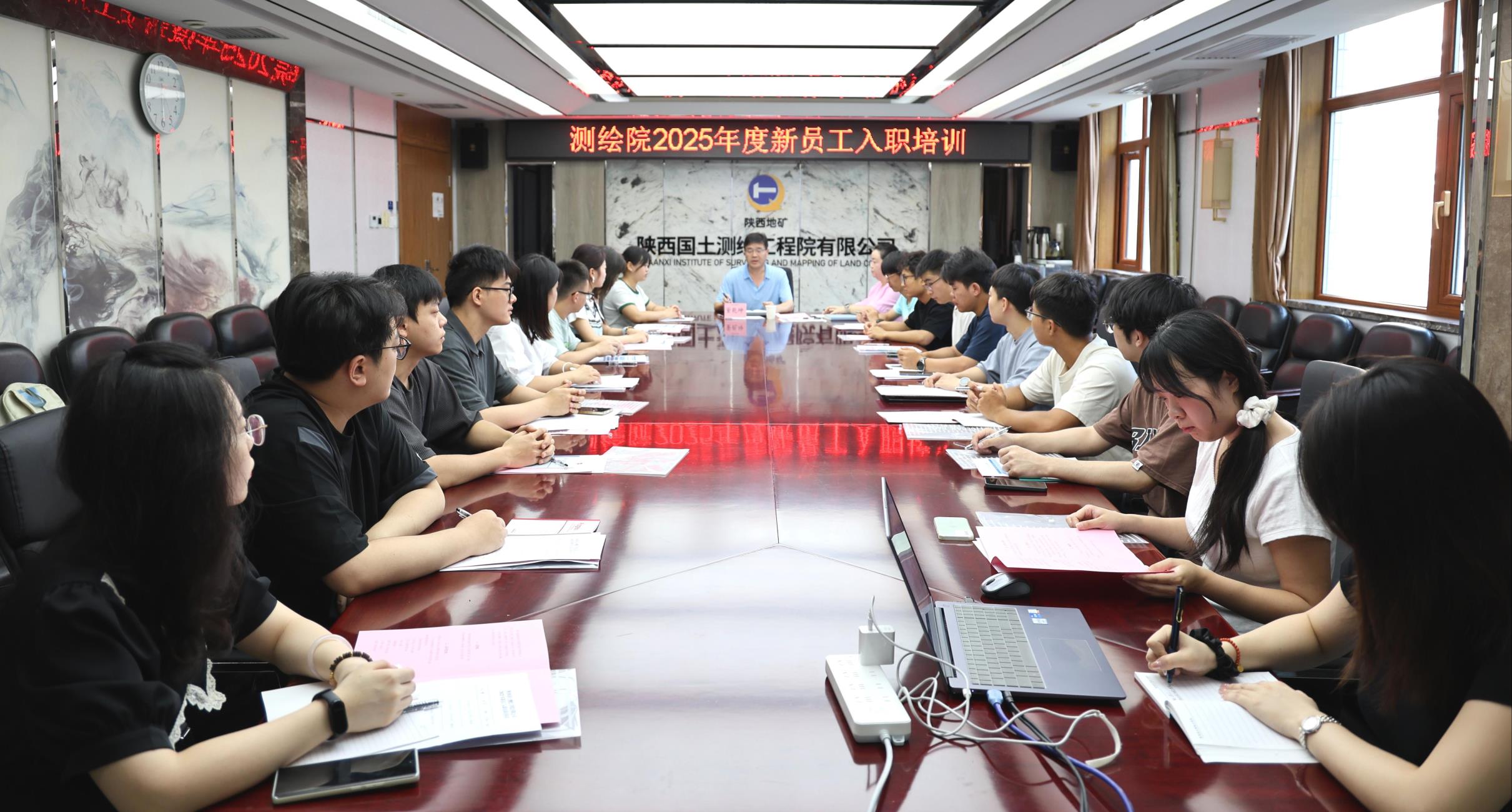 董乾坤代表公司党委对新员工的到来表示欢迎和祝贺,深情追溯了测绘院发展历程和公司历史沿革,重点向大家介绍了“三光荣、四特别”地质精神和公司在主责主业方面的发展进程及优势等。董乾坤围绕“成长、责任、担当”对新员工提出三点期望:一是以企为家,与企同行。 要厚植爱院爱岗情怀,将个人成长融入企业发展,以高度的责任感和使命感投身事业,实现个人与企业的共同成长;二是勤学善思,精进不止。 要树立终身学习理念,紧跟行业前沿,主动掌握测绘地理信息新技术,不断提升专业素养,成为推动公司创新发展的中坚力量;三是勇于担当,实干笃行。 要牢固树立责任意识,以“功成必定有我”的担当做好本职工作,面对挑战迎难而上,及时沟通协作,以务实作风破解难题。他勉励大家以此次培训为起点,在未来工作中,恪尽职守、担当作为,在公司发展过程中努力实现个人价值,不负时代、不负韶华、不负公司党委的殷切期望。